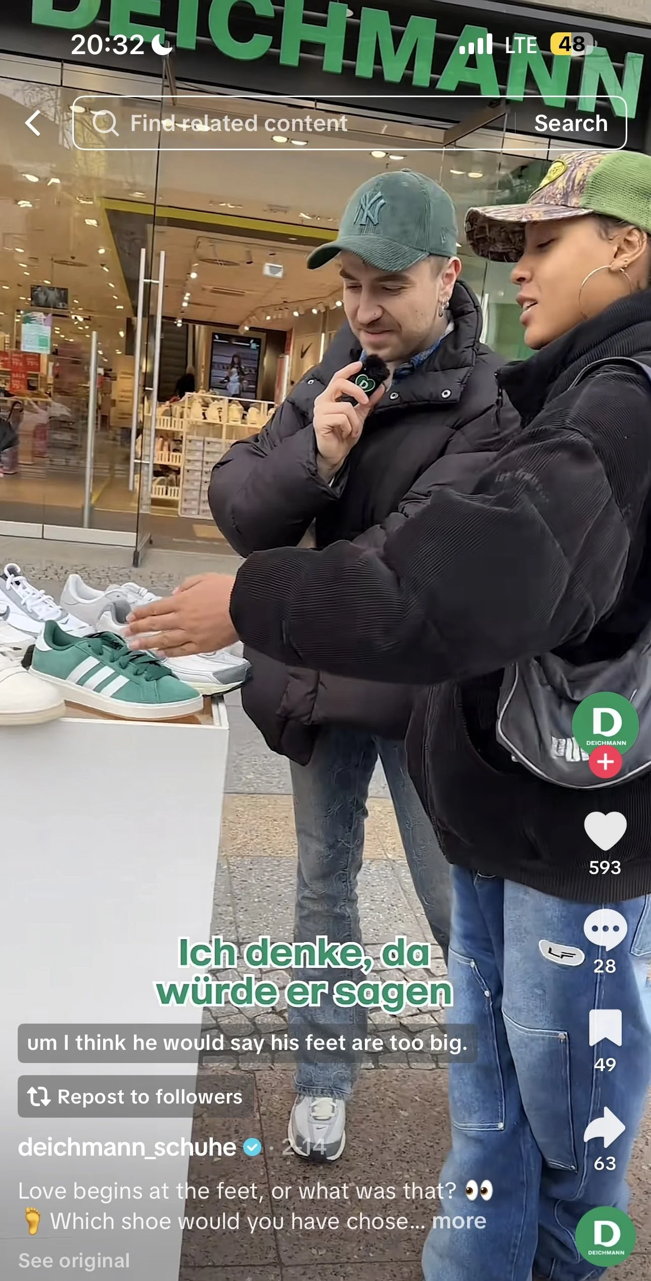 For the IRL activation, we conducted and filmed street interviews around the topic with passers-by in Berlin (“What shoe would make you break up?”), and couple challenges (“Can your partner guess your favourite shoe?”). Extensions included a creator series (recommending “break-up shoes”), interactive formats and couples style inspiration content.
